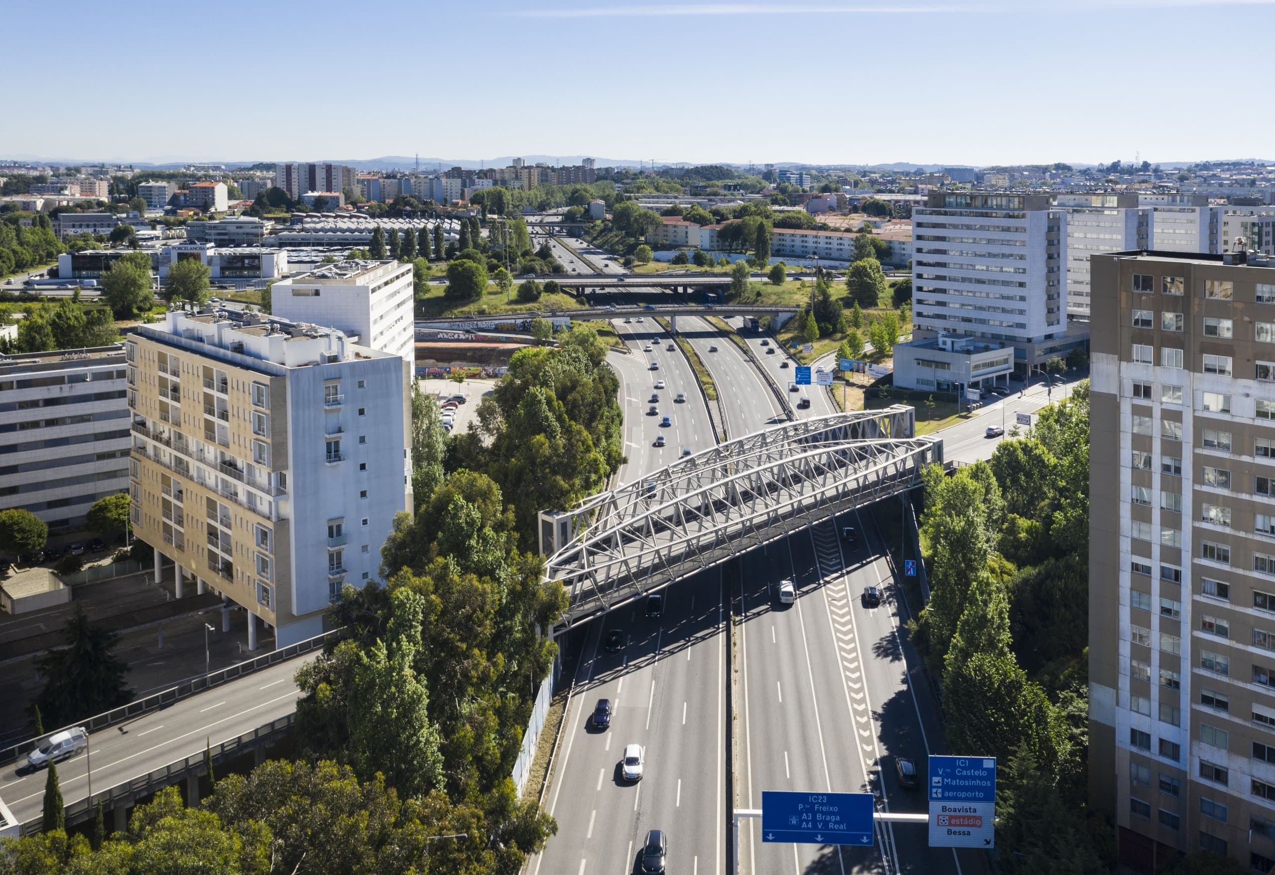The project is part of the construction of a new avenue inserted in the urban network of the west side of the city of Porto. The viaduct was designed as a metallic structure that links in a single element the distance between the two sides of Porto’s ring road – 84 meters. The metallic construction made it possible not only to shorten the construction times but also to have a minimal impact on the traffic flow: the structure was built on the adjacent terrain and later moved to its current location.