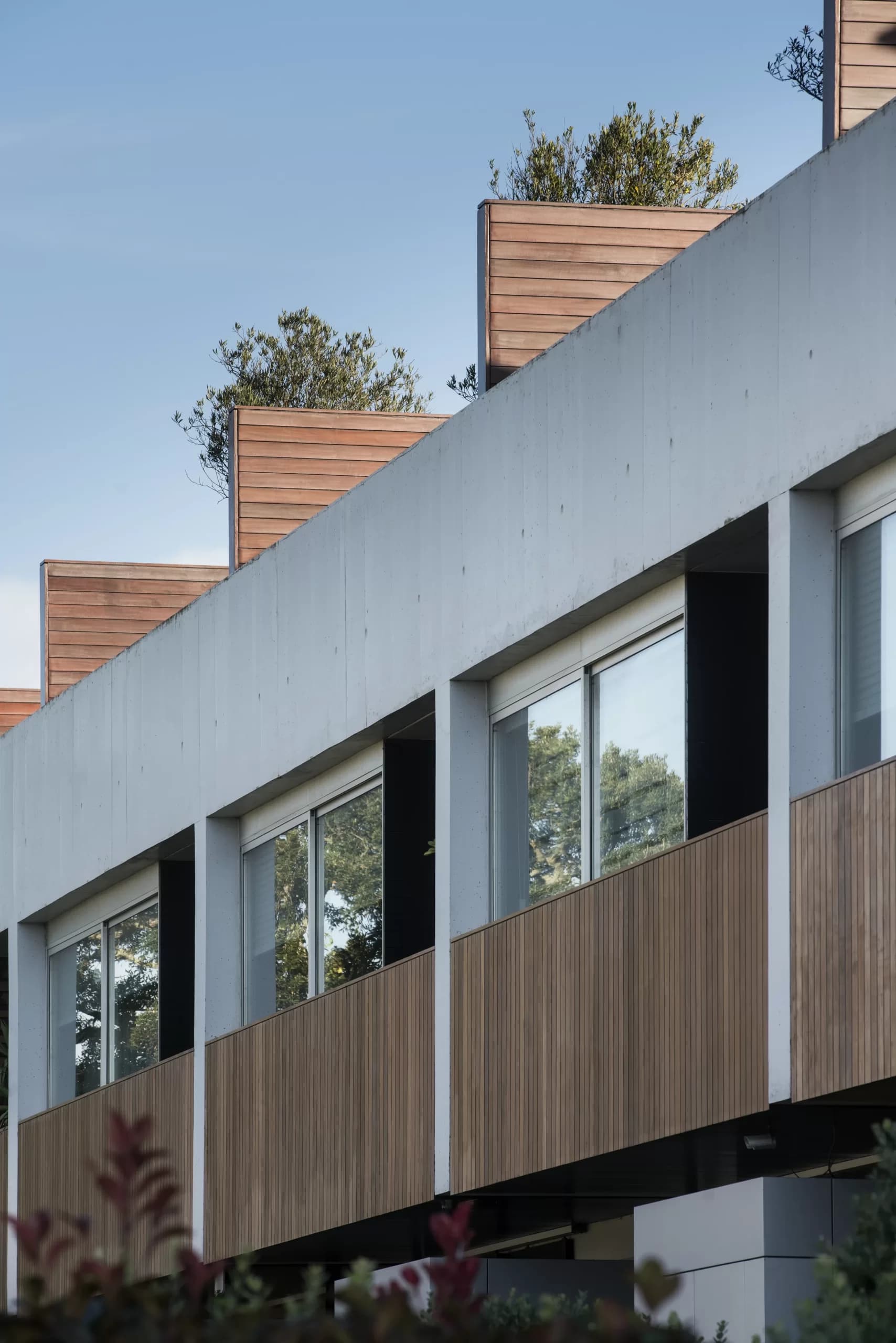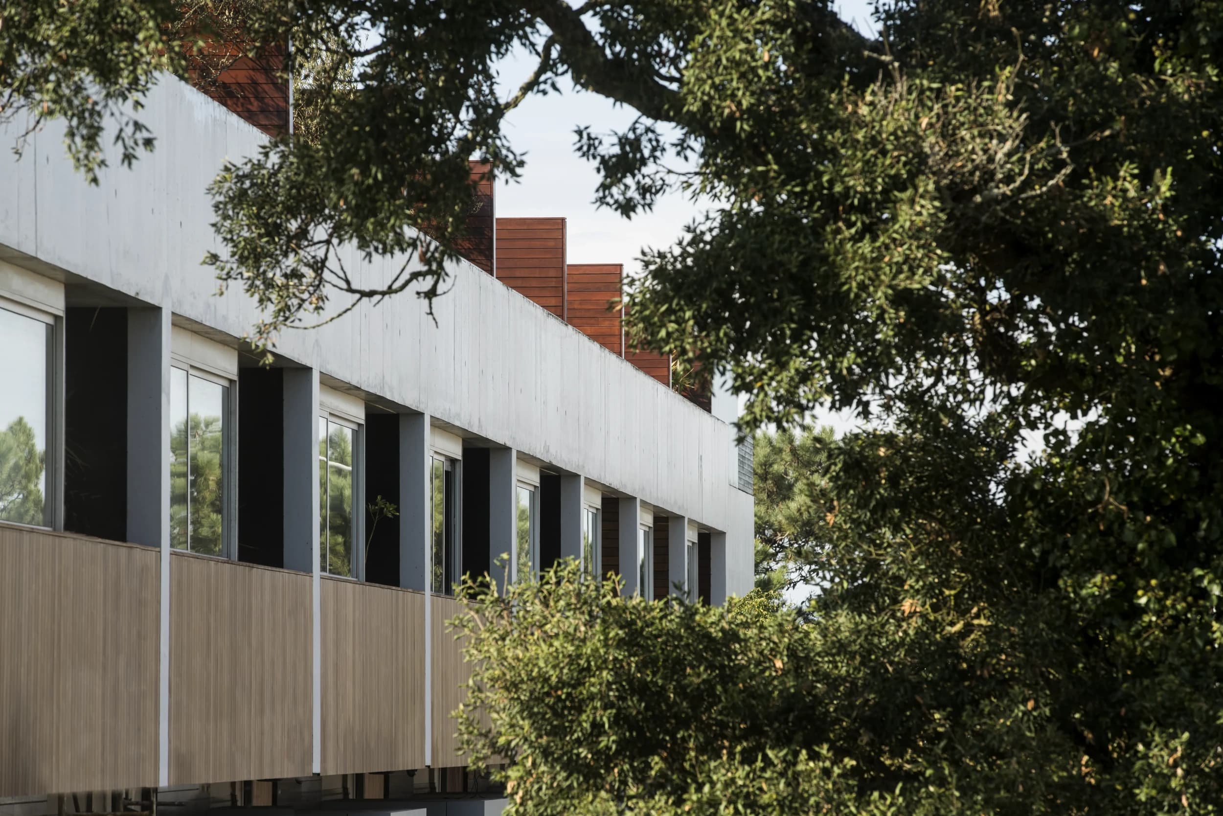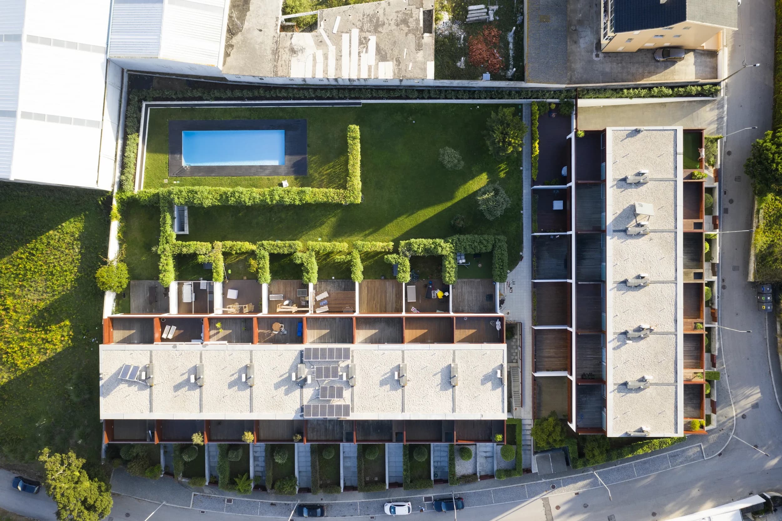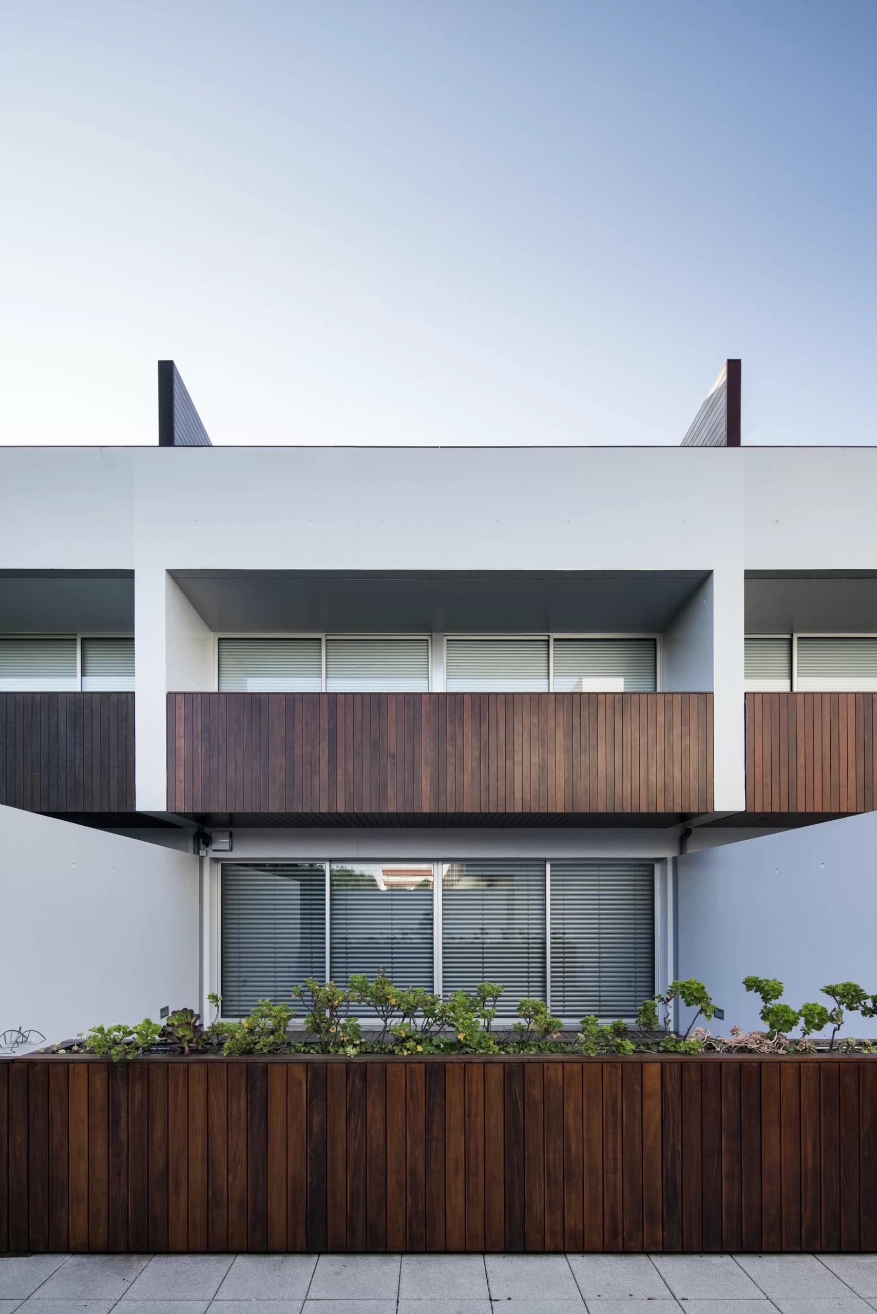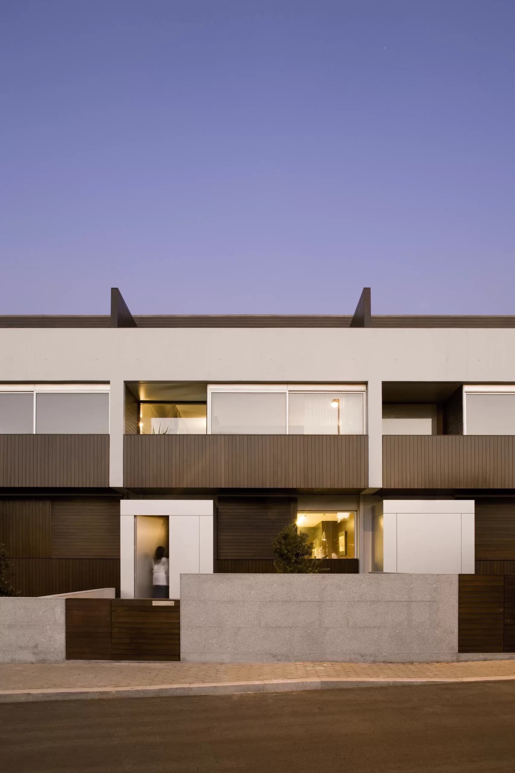 Prata row houses are constituted by an l-shaped pair of volumes, which are connected through a shared basement. The facades are characterized by wide openings and balconies that allow the delimitation of each dwelling, without compromising the longitudinal cohesion of the building. All houses benefit from direct access to the street and have private patios in the back. There are also amenities for collective use, such as green areas and a swimming pool.