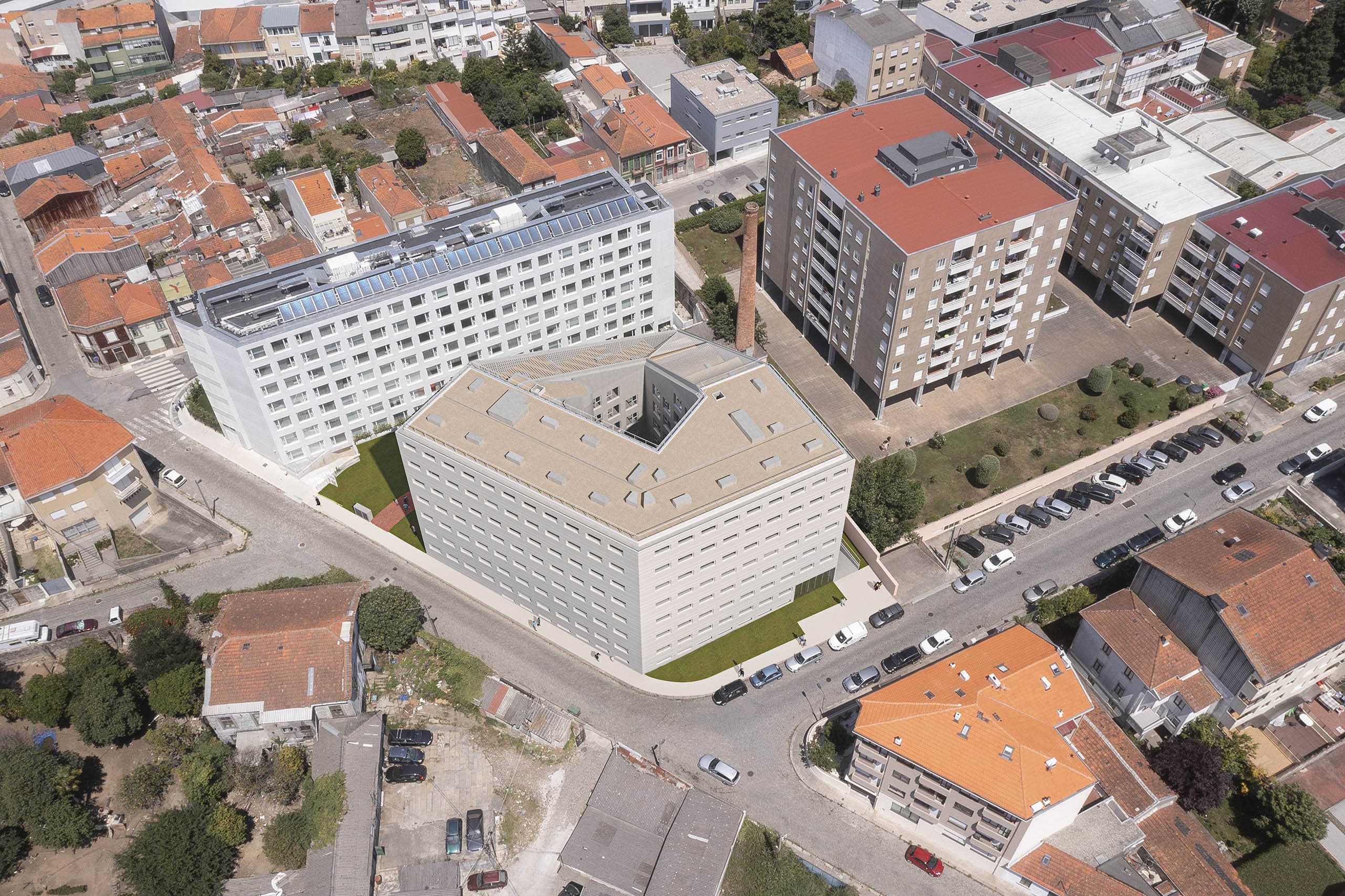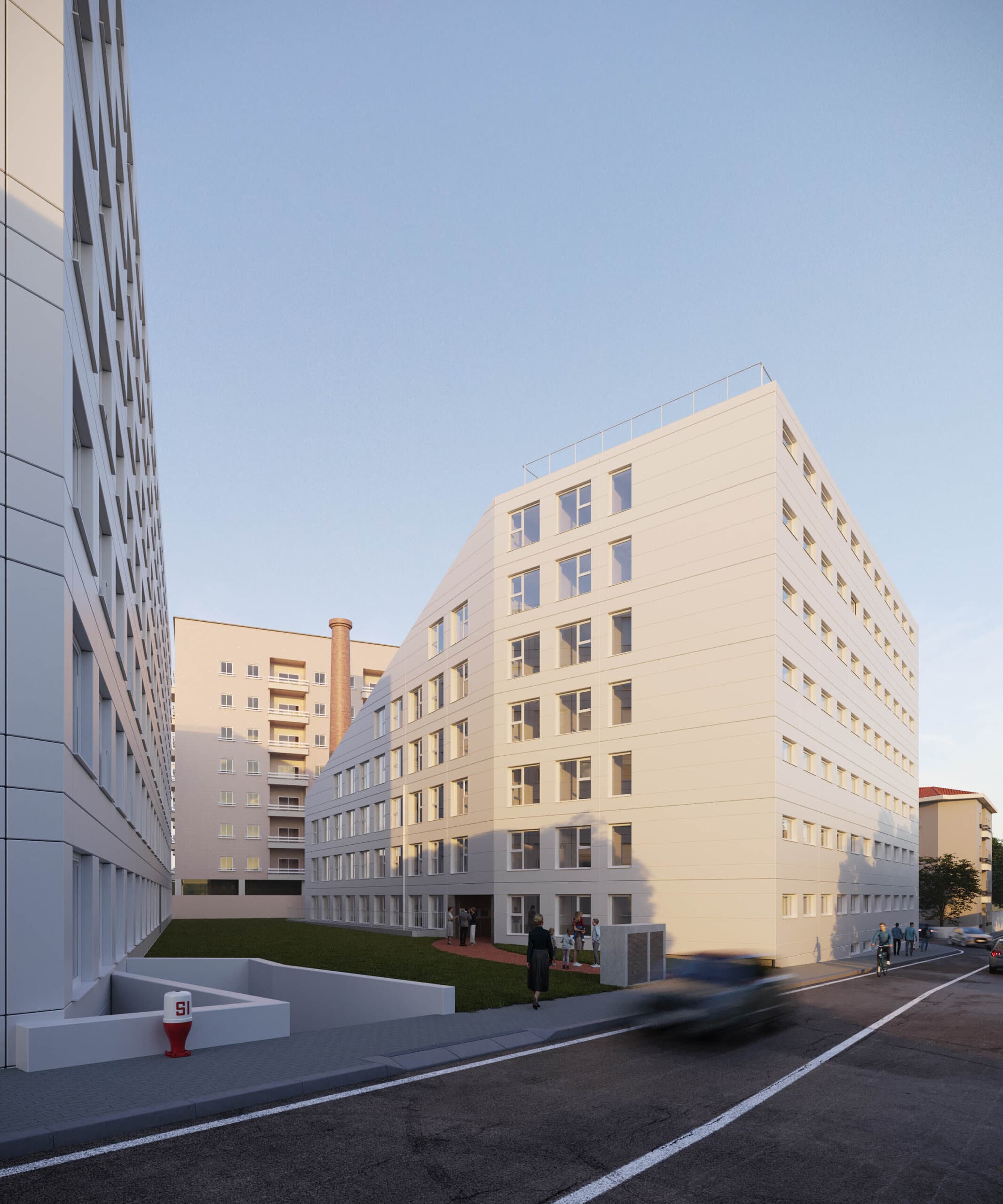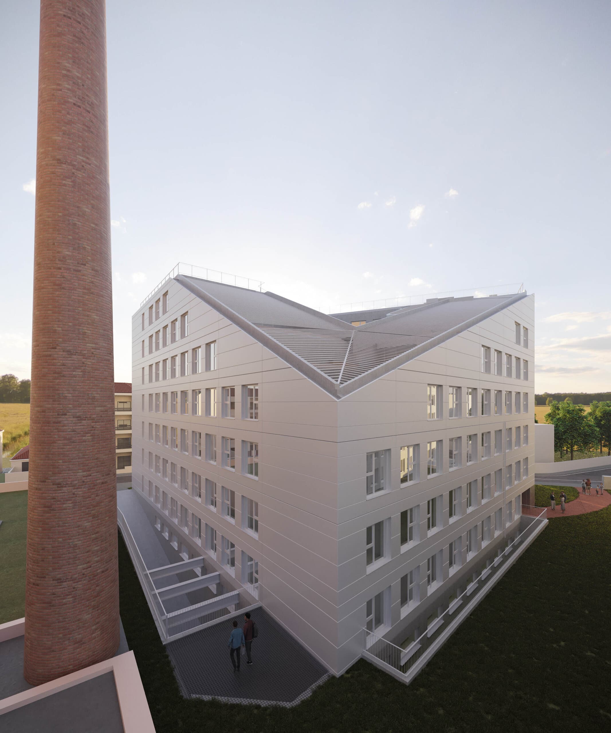 Studyou II Student Residence is located in the city of Porto, within the Asprela University Campus. The residence is being built on a site where a large brick chimney remains, serving as a vestige of the area's industrial past. This old chimney stands as a historical landmark that the project aims to preserve and integrate. Brick was selected as the primary material for both the walls of the inner courtyard and the surrounding pavement. The building’s shape, which initially followed an L-configuration, ultimately evolved into a V-like form as a result of site constraints and the regulatory criteria established by the Municipal Master Plan (PDM).