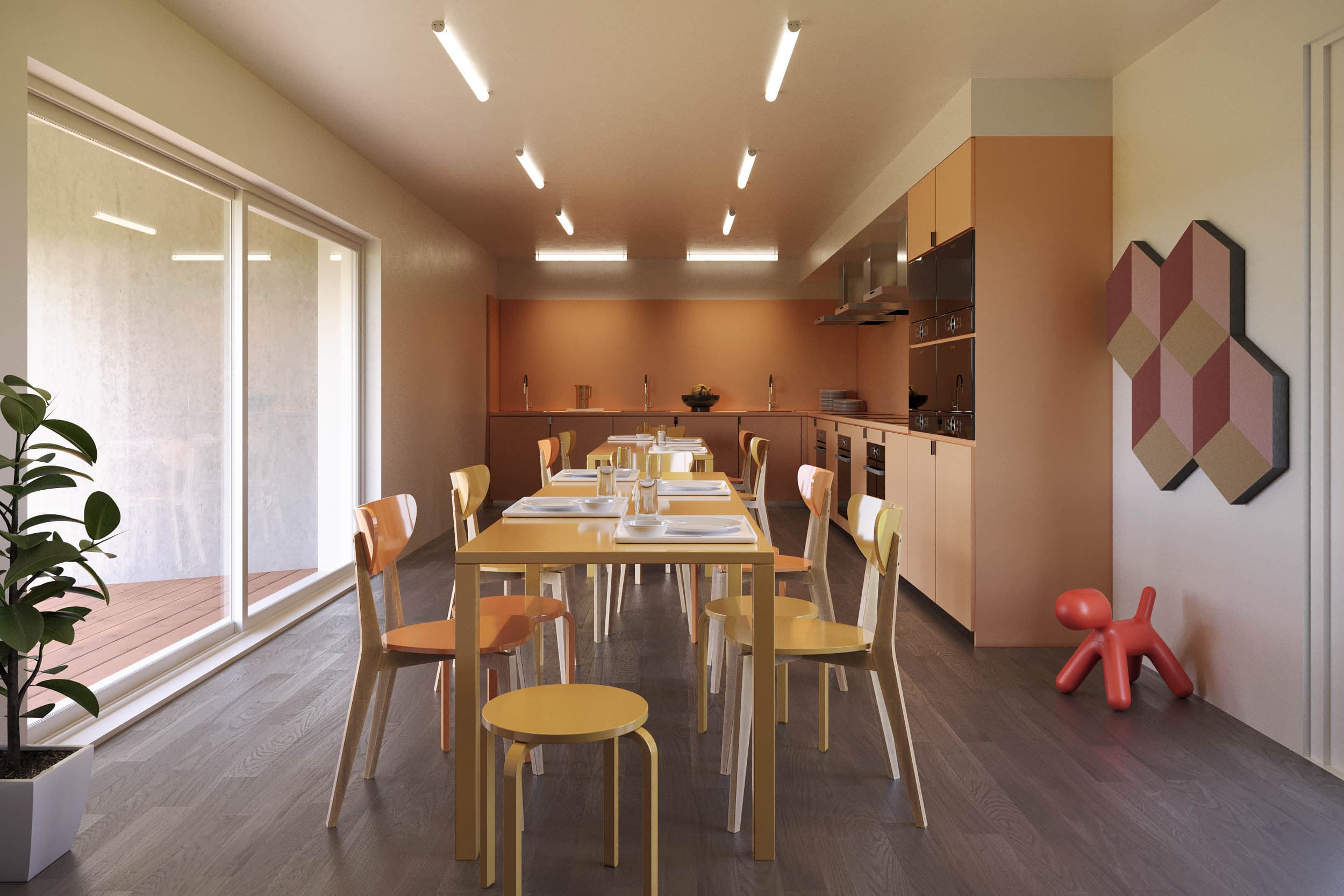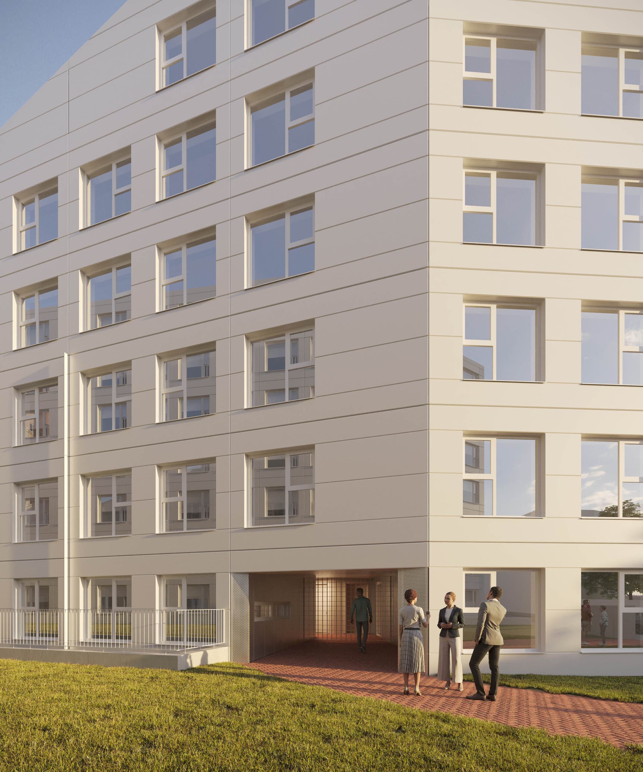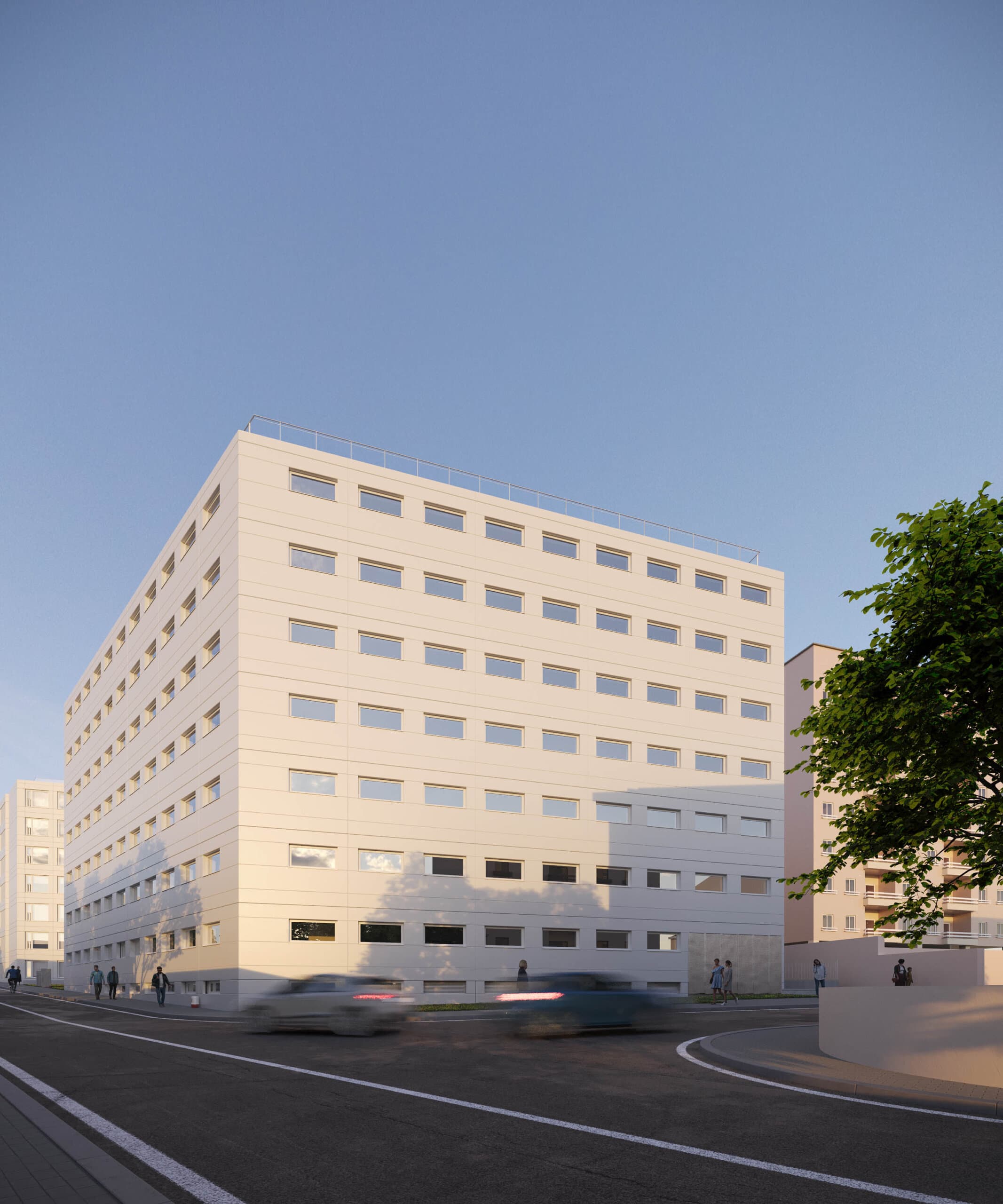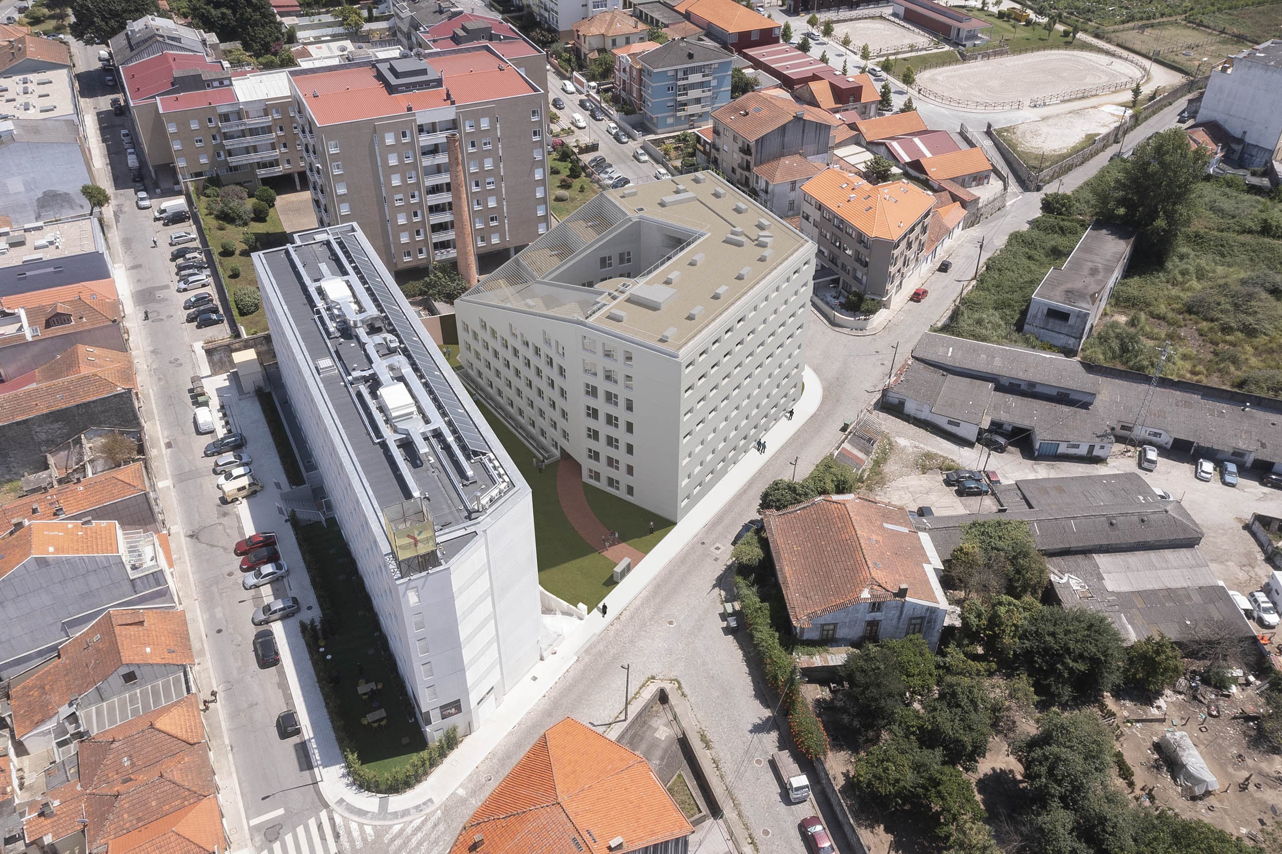 Studyou II Student Residence is located in the city of Porto, within the Asprela University Campus. The residence is being built on a site where a large brick chimney remains, serving as a vestige of the area's industrial past. This old chimney stands as a historical landmark that the project aims to preserve and integrate. Brick was selected as the primary material for both the walls of the inner courtyard and the surrounding pavement. The building’s shape, which initially followed an L-configuration, ultimately evolved into a V-like form as a result of site constraints and the regulatory criteria established by the Municipal Master Plan (PDM).
