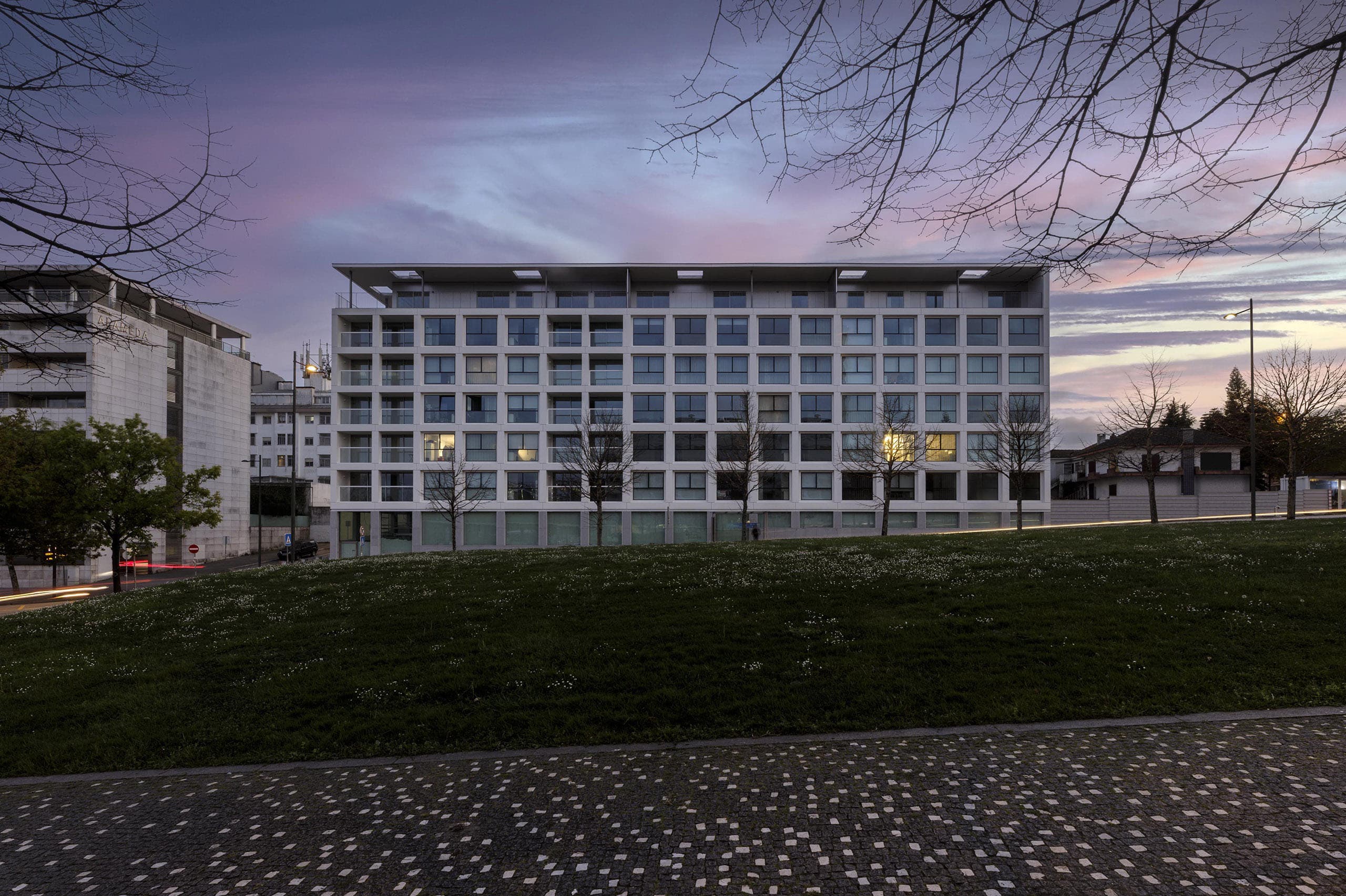 Alameda 303 is a mixed-use building (housing and services) with a view over Antas Avenue, characterized by simple cubic forms and a ventilated facade in stapled stone and aluminum composite. The housing program is developed in the six upper floors. The building is served by two floors of underground parking and also a ground floor dedicated to commerce and services. The proposed layout creates very illuminated compartments, which allow taking advantage of the sunlight. The exterior arrangements will include a lawn and also a green “curtain”, acting as a nature wall between the construction and the rear building.