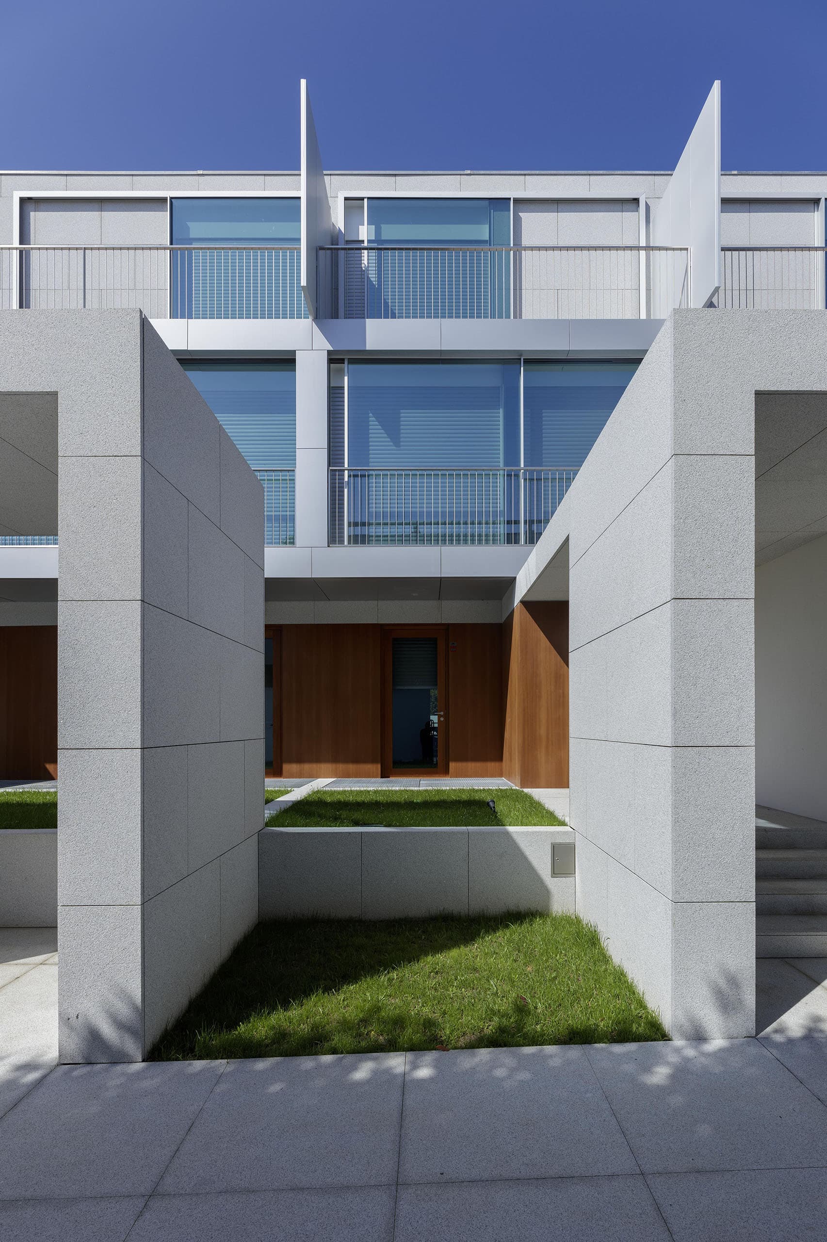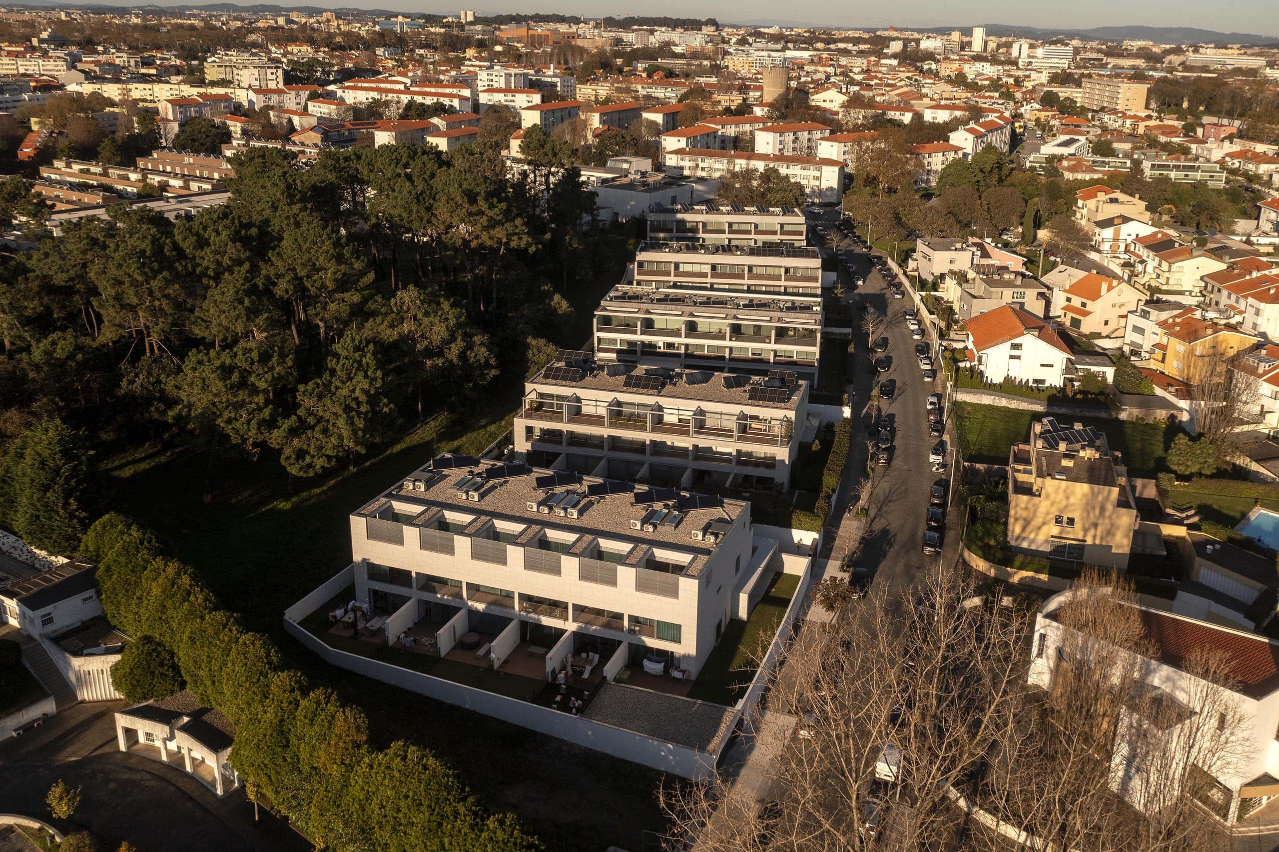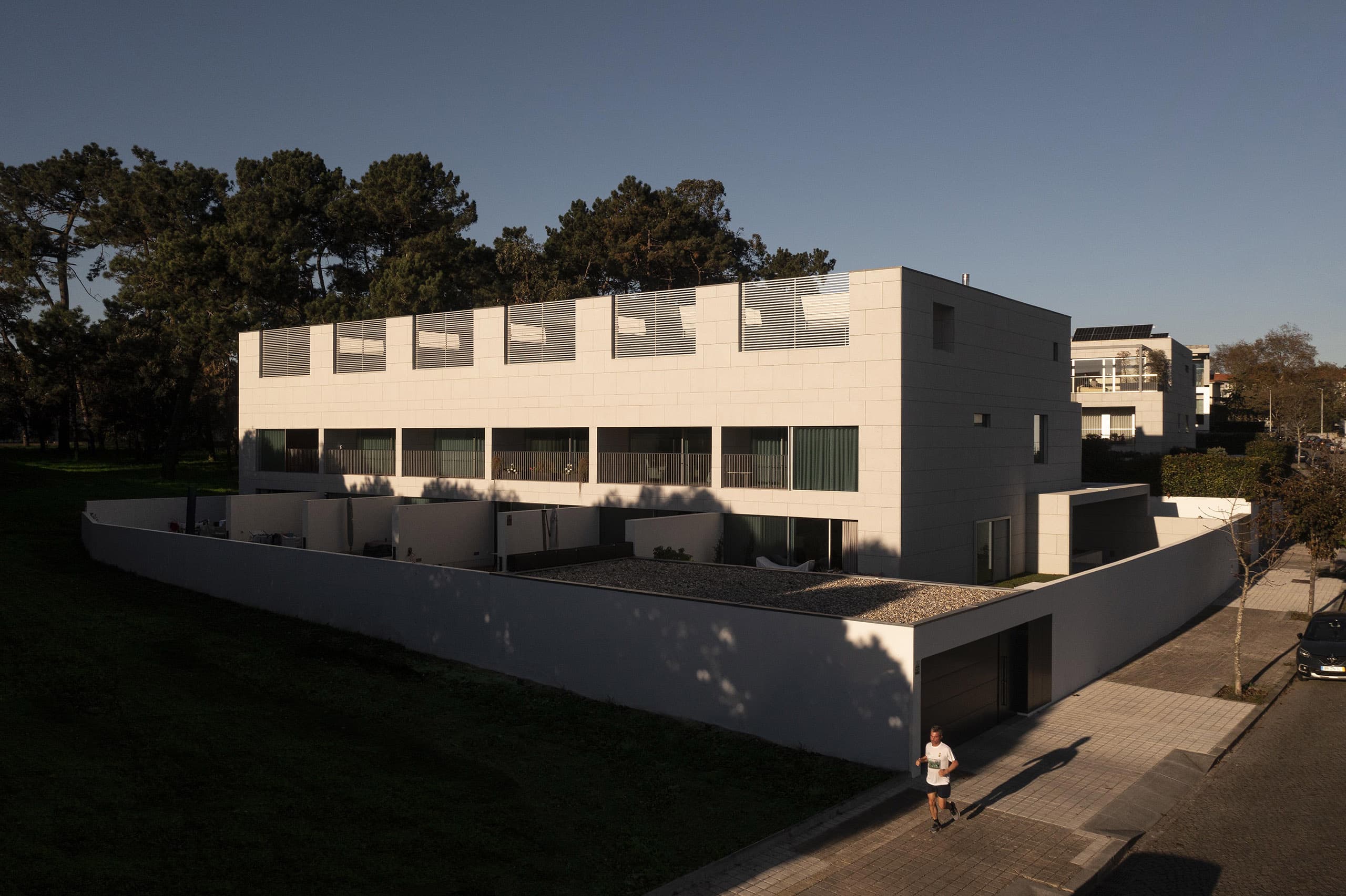 Magnólias Houses, located in Aldoar, near Avenida da Boavista and Parque da Cidade. This project explores the relationship between indoor and outdoor spaces through fluid pathways that engage the senses. Along the way, elements such as walls, pavements, volumes, textures, colors, and lighting effects enhance the spatial experience. At the entrance of each home, a landscaped and paved area, combined with a play of overhangs and openings, reinforces the identity of each house while providing a more private and welcoming environment.