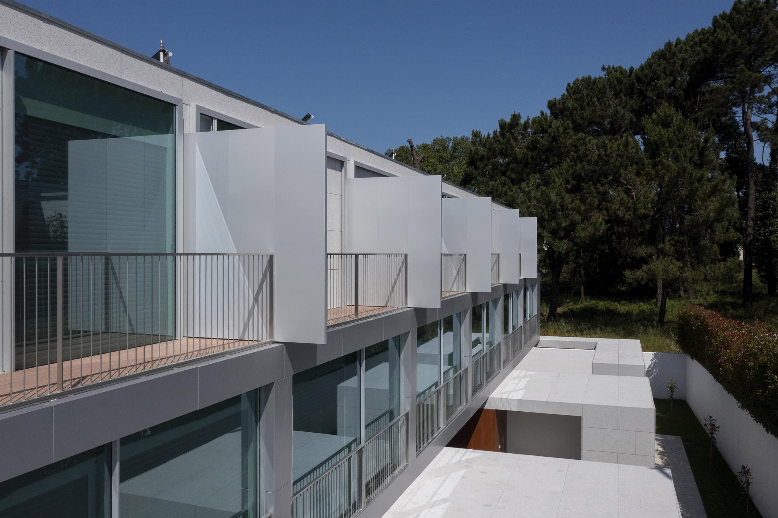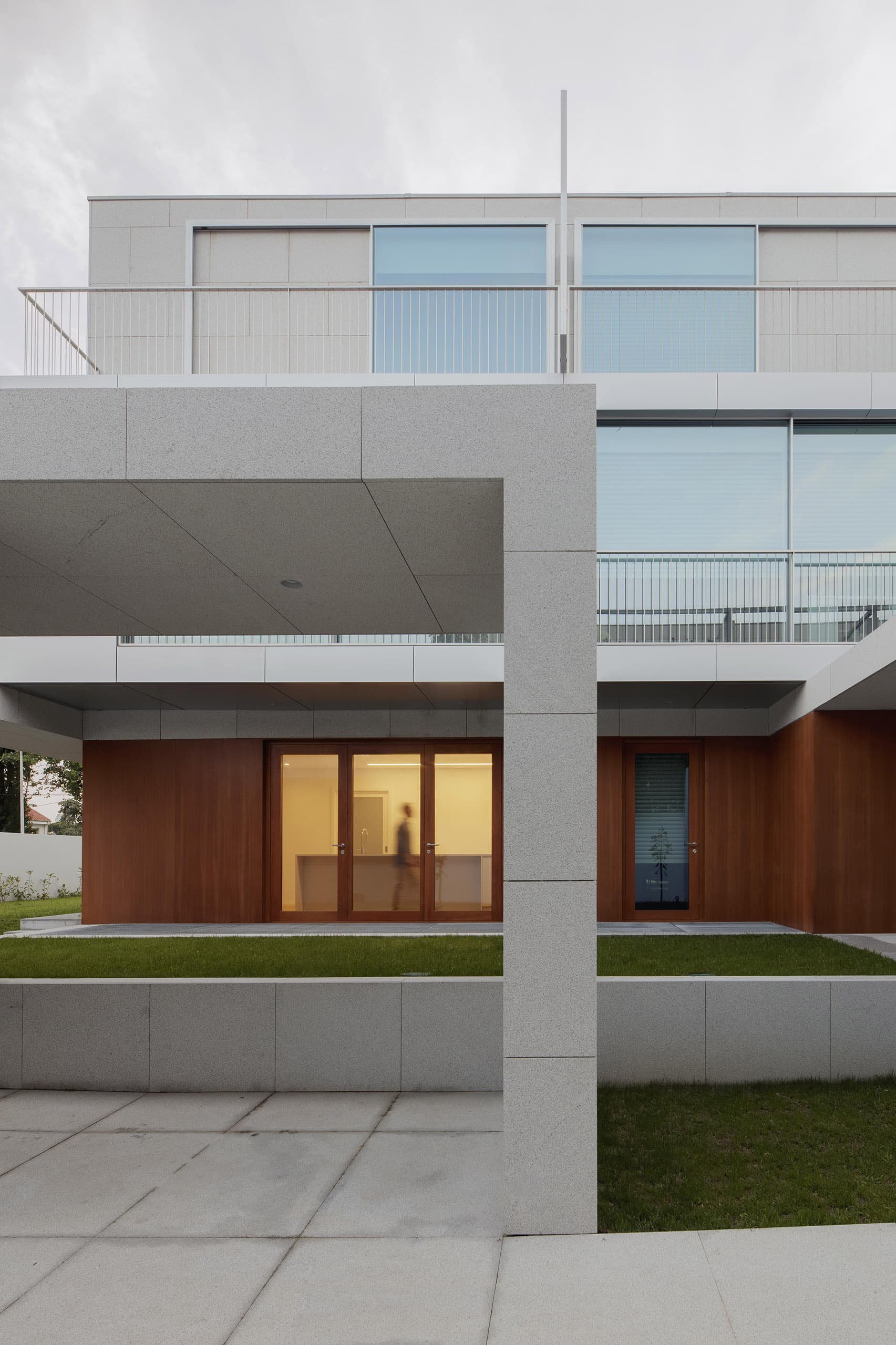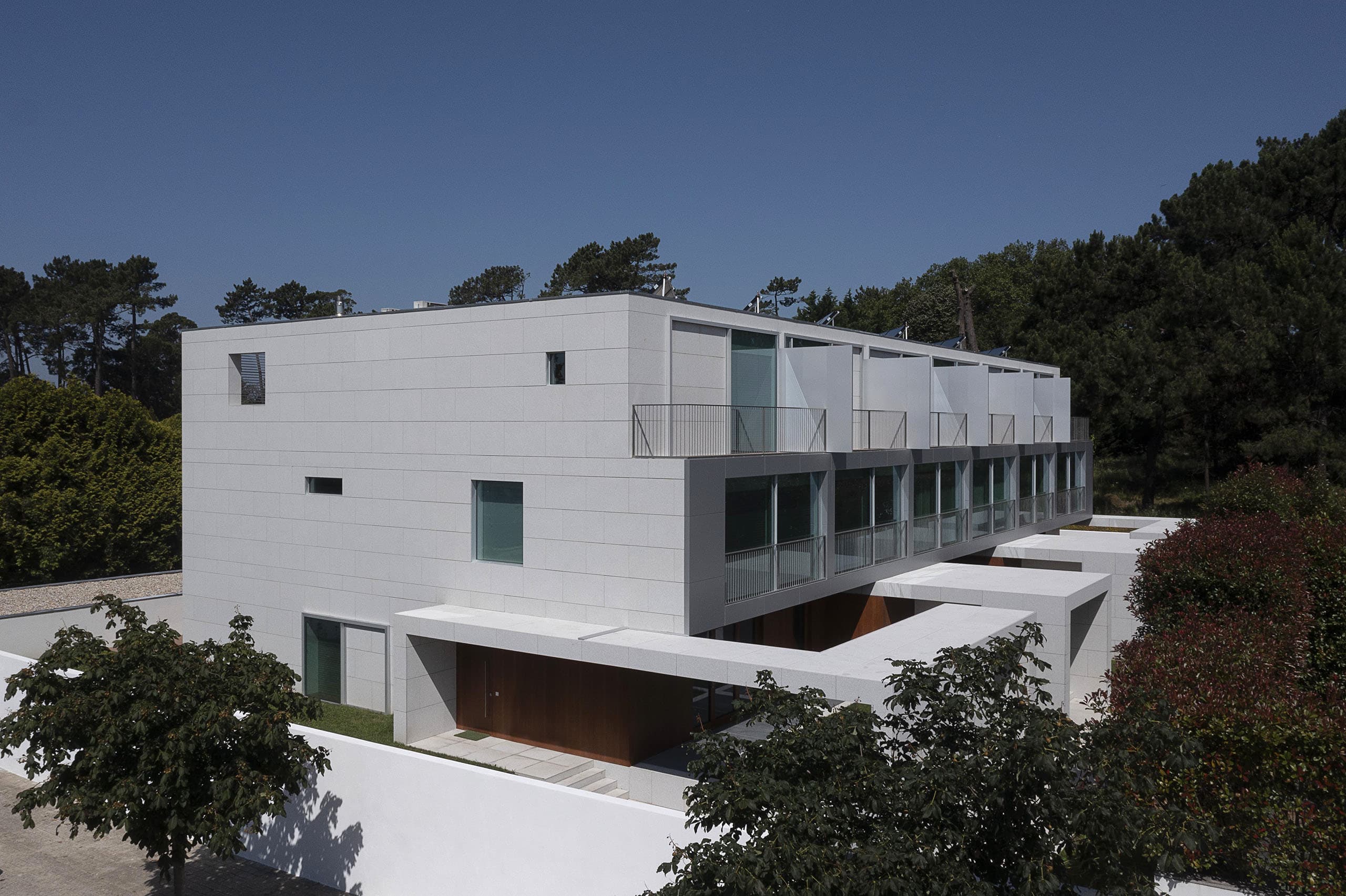 Magnólias Houses, located in Aldoar, near Avenida da Boavista and Parque da Cidade. This project explores the relationship between indoor and outdoor spaces through fluid pathways that engage the senses. Along the way, elements such as walls, pavements, volumes, textures, colors, and lighting effects enhance the spatial experience. At the entrance of each home, a landscaped and paved area, combined with a play of overhangs and openings, reinforces the identity of each house while providing a more private and welcoming environment.