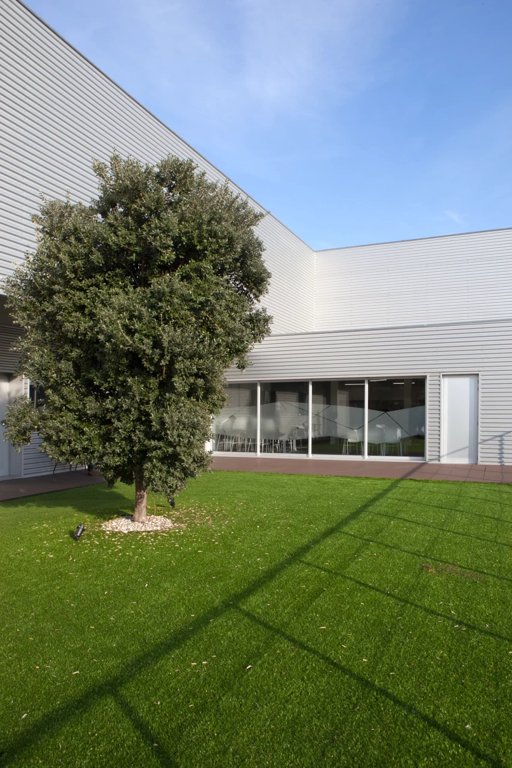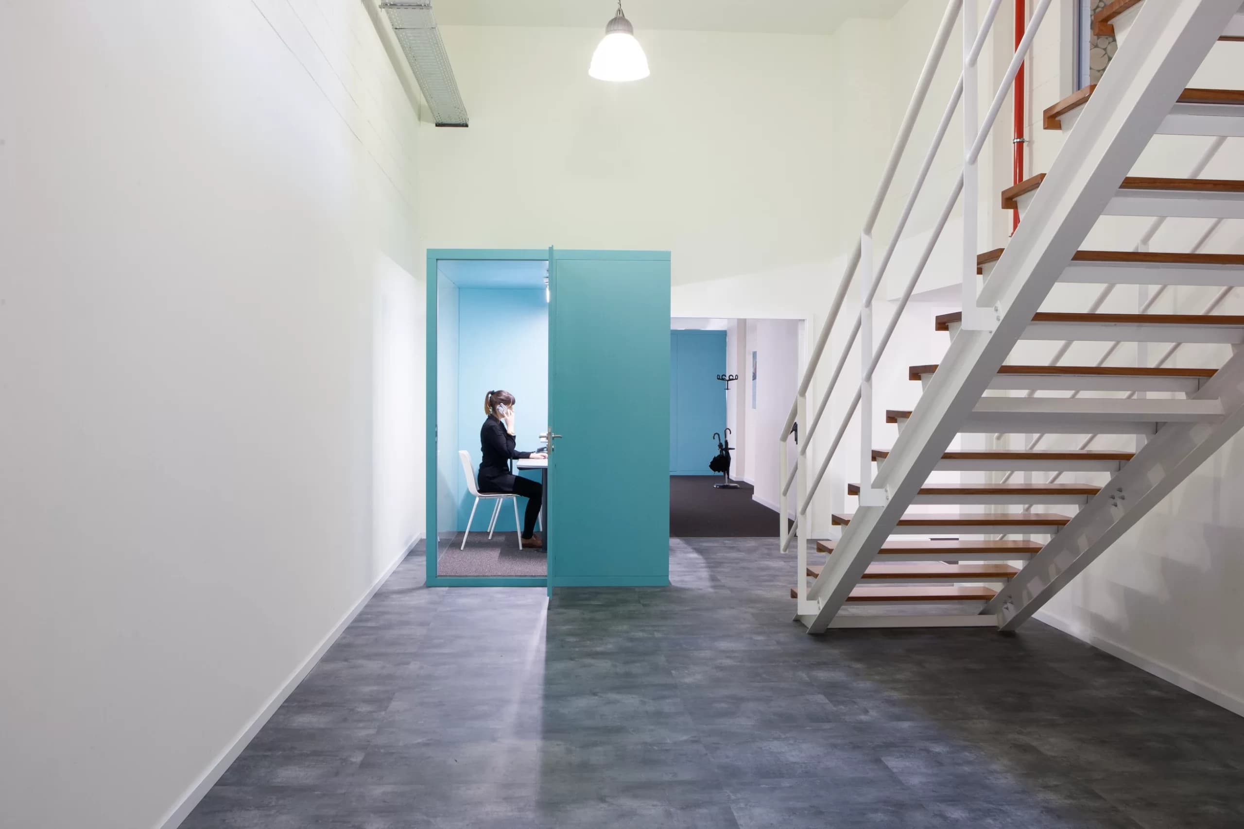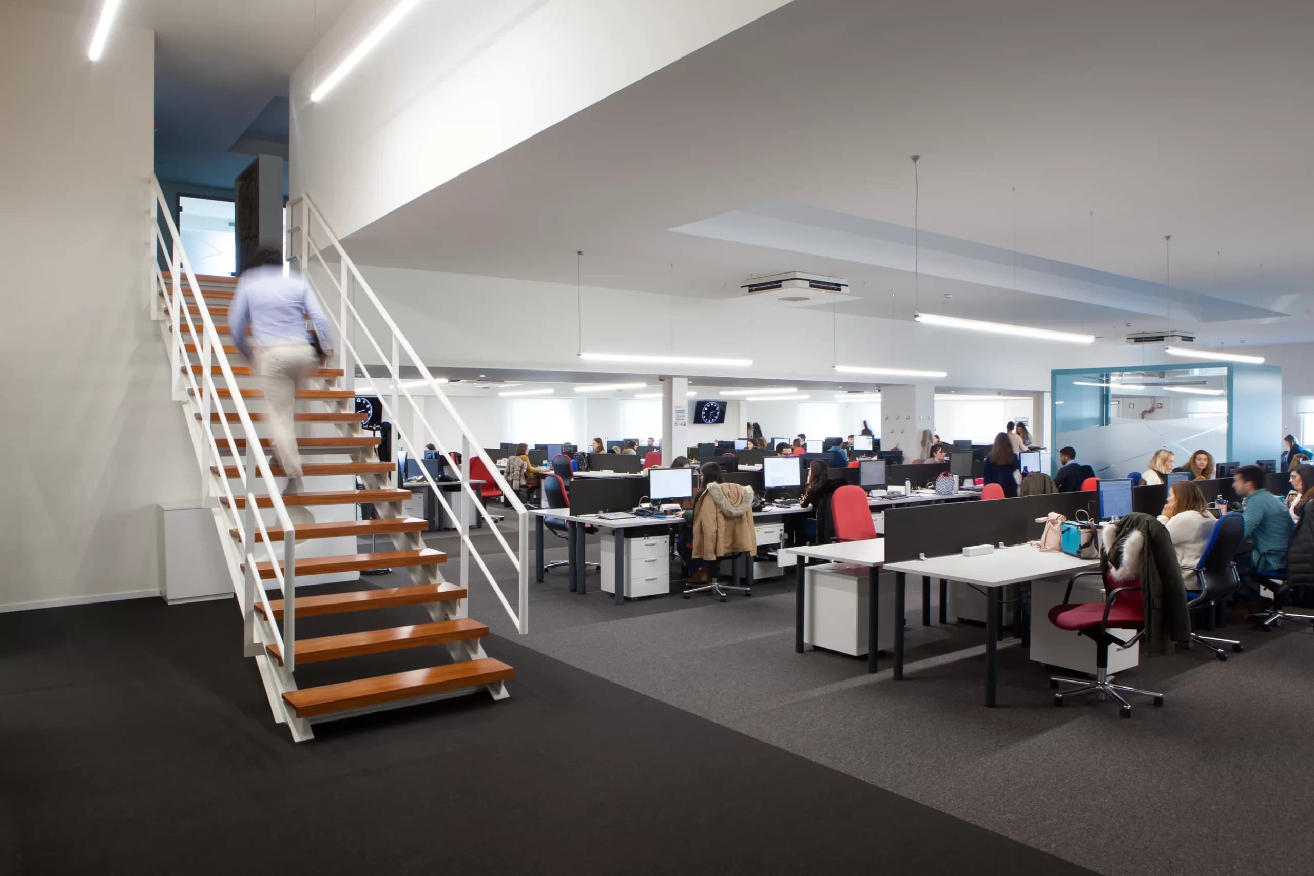 Desenvolvidas num edifício de traça industrial, as instalações da Infineon foram projetadas de forma a criar um ambiente de trabalho amplo e organizado com luz natural constante. No piso térreo, um imponente open space dá lugar a cerca de 450 postos de trabalho, e pequenas “boxes” vão emergindo ao longo do espaço servindo um propósito visual - introduzindo dinamismo e cor - e também funcional - permitindo a realização de reuniões curtas e conversas telefónicas. Ao manter o pé direito original de seis metros e as campânulas de luz, o projeto respeita o seu histórico industrial e de serviços e adapta-o a um ambiente de escritório versátil e ajustável, de larga escala.