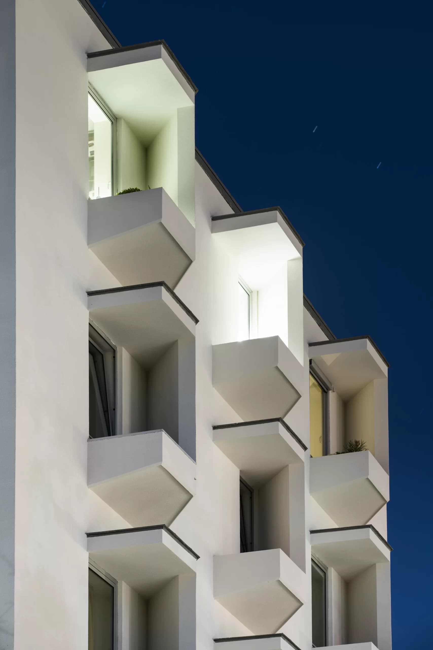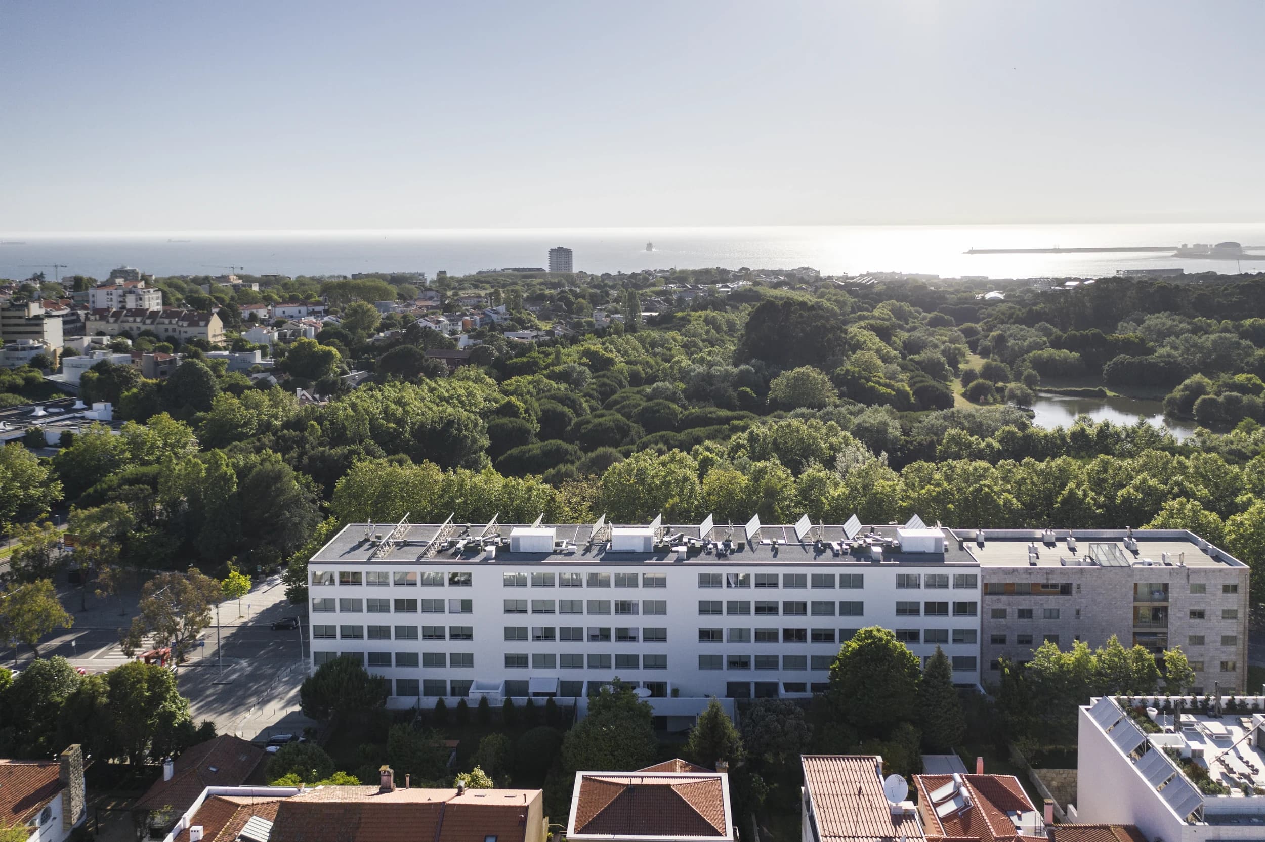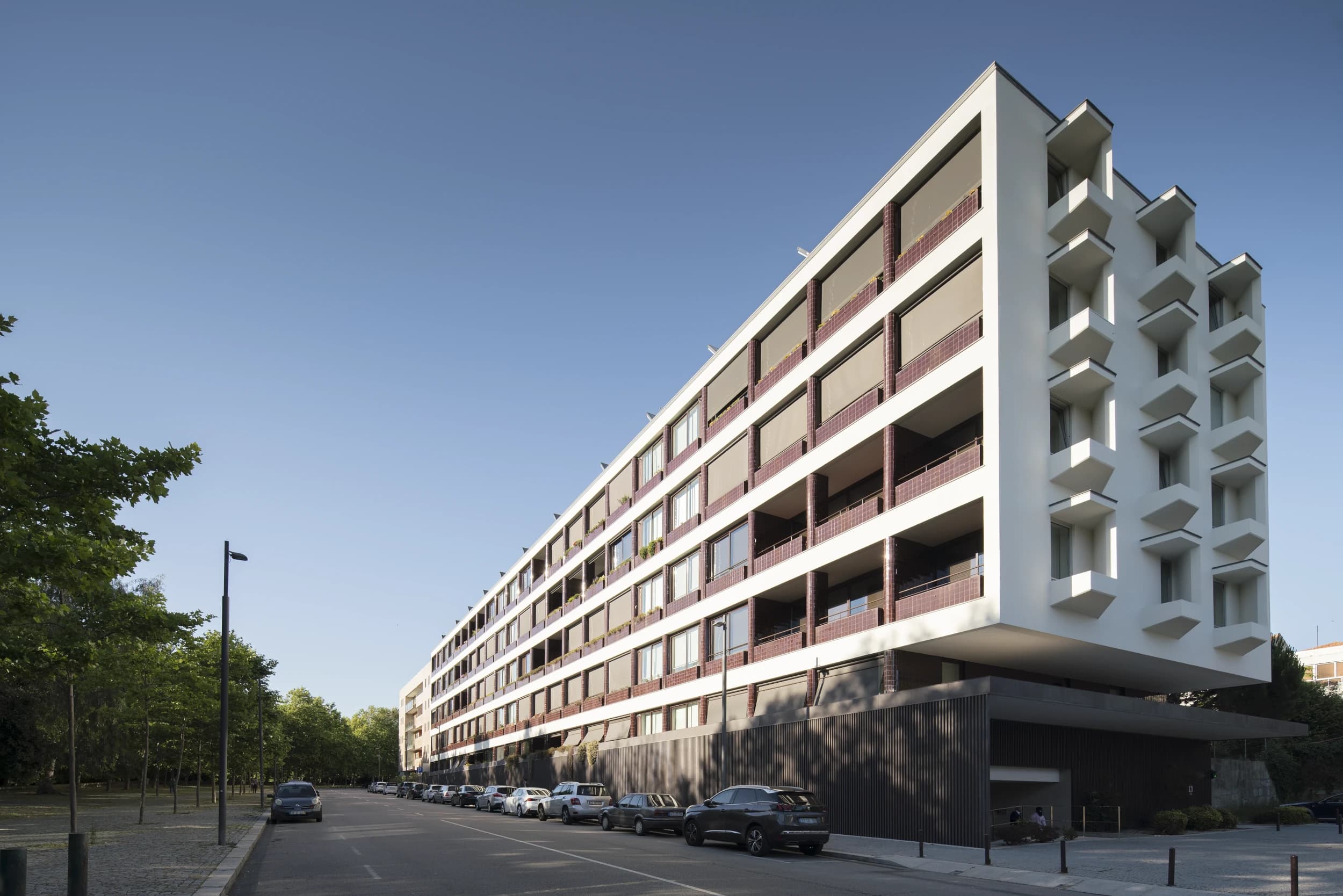 Implantado à entrada do Parque da Cidade do Porto, o projeto apresenta um volume paralelepipédico com as fenestrações inseridas numa quadrícula rigorosamente modulada, revestida a reboco à cor branca e azulejo. Tratando-se de um programa habitacional distribuído por seis pisos acima do solo, o volume desenvolve-se sobre uma base – homogeneamente revestida a ripado em aço corten – capaz de acompanhar o declive do terreno e com os espaços de entrada e convívio de residentes a ocupar um piso semi-enterrado.